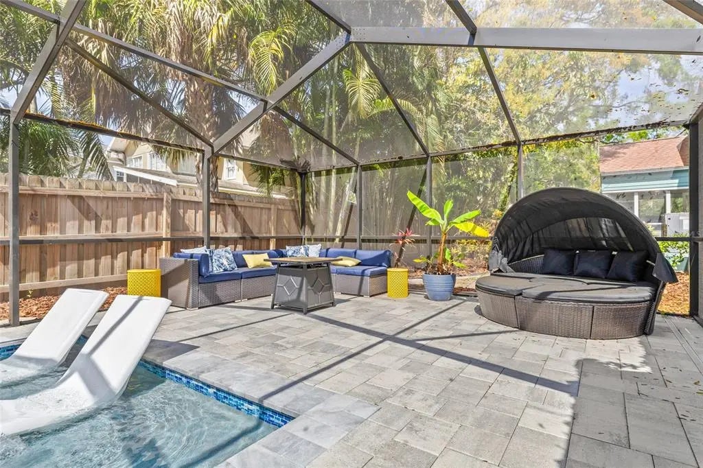 Step outside, and you're transported into a one-of-a-kind backyard. A wrap-around deck with a shaded pergola invites you to unwind on warm summer nights, whether you're lounging in your hammock or hosting friends and family. Your brand new 2024 saltwater, gunite pool—and your fully screened enclosure not only offers seamless indoor-outdoor living but also ensures easy maintenance, keeping your pool pristine year-round . With both heated and chilling options, this pool is perfect for year-round enjoyment, ensuring comfort through all seasons. An irrigation system keeps the lush lawn vibrant and healthy throughout the year. In addition, this home has aluminum siding and a spacious detached 2-car garage just steps away providing secure, covered parking with alley access and extra storage space.